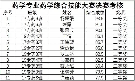 经过初赛,共21名同学从两个专业比赛中脱颖而出进入决赛前技能强化及决赛。21名同学在专业指导教师精心指导下,刻苦训练,操作技能突飞猛进。药学、中药学两个专业的评委秉着公平、公正、公开的原则,对21名选手进行了决赛。成绩见下表: