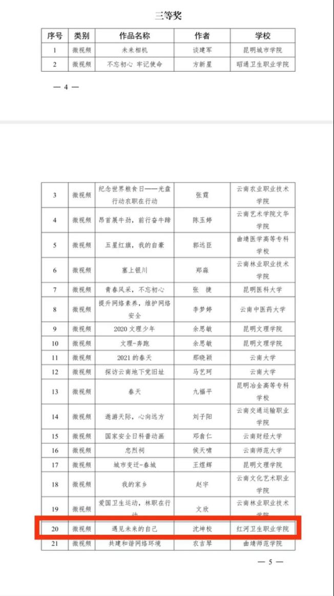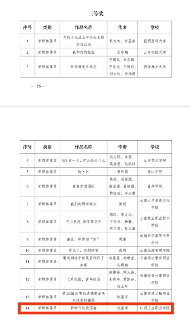 近日,中共云南省委教育工委、中共云南省委网络安全和信息化委员会办公室公布了第五届云南省大学生网络文化节和云南省高校网络教育优秀作品获奖名单,经学校推荐、专家评选、公示等环节,我校赵孟清老师获得新媒体作品三等奖,沈坤校同学获得微视频类三等奖。