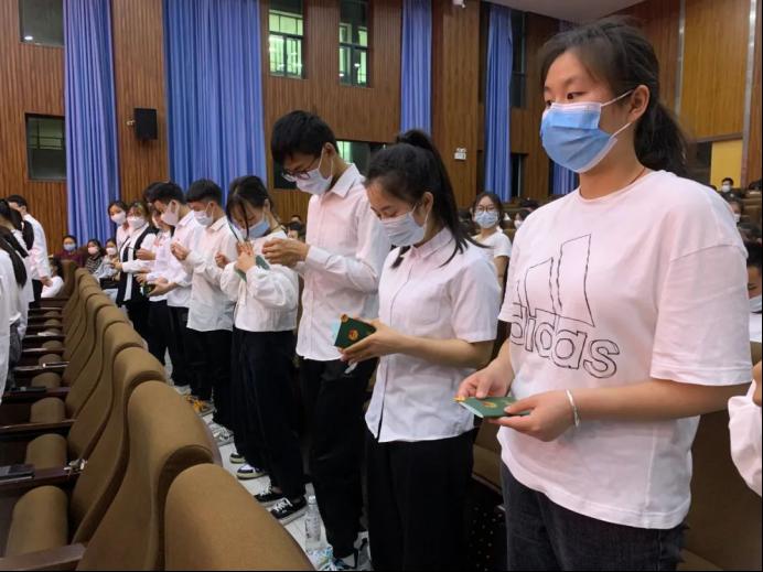 在新团员入团仪式上,学校领导、老师向47名新团员颁发了团章、团员证和团徽,新团员面对团旗庄严宣誓。