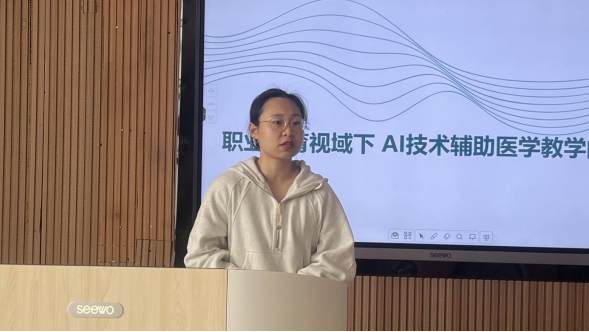 会上,黄碧瑶老师以“职业教育视域下AI技术辅助医学教学的探索”为题,分享了其在培训项目中的学习成果与实际应用经验。她通过案例展示了AI助教在免疫学教学中的创新运用,她指出,AI技术突破了传统教学的时空限制,借助智能模型大大提高了教学效率,有助于提升学生学习的兴趣。她特别提出“替代你的不是AI,而是会使用AI的人”,引发大家的深思与共鸣。