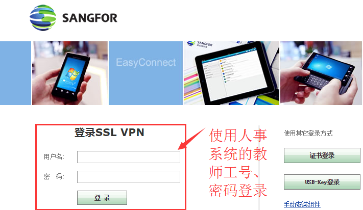 第三步:浏览器页面变成VPN登录界面,输入人事系统的教师工号和密码进行登录。