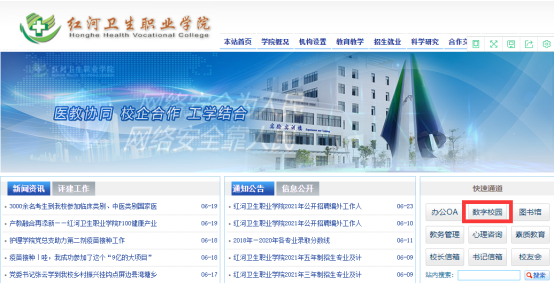 一、进入我校官网(官网地址:www.hhwzy.edu.cn),点击“数字校园”,进入数字校园平台。