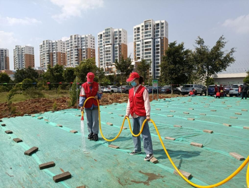 植树现场老师为志愿者分发树苗种子,志愿者们互相配合,分工合作。有的挥锹铲土、有的扶树填土、有的浇水、有的拉盖薄膜。以保证树苗的生长各环节都精心对待,栽得认真,干得卖力,整个植树活动现场呈现一片热火朝天的劳动景象。活动持续开展半天,志愿者们不畏辛苦,以极大的热情投入进来,为绿化校园,打造绿色学习环境贡献了自己的一份力量。