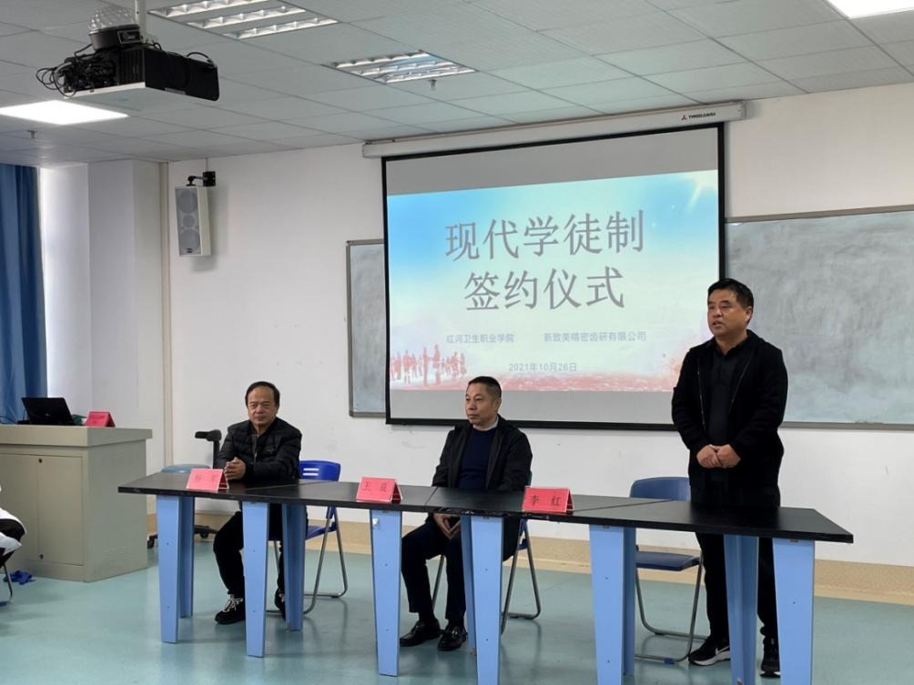 在同学和老师热情的掌声中我们迎来了本次拜师仪式中至关重要的一步,签订三方协议。三方协议由红河卫生职业学院副院长杨军、深圳新致美精密齿研有限公司集团常务副总兼管人事王良、红河卫生职业学院口腔学院学生代表完成签订。