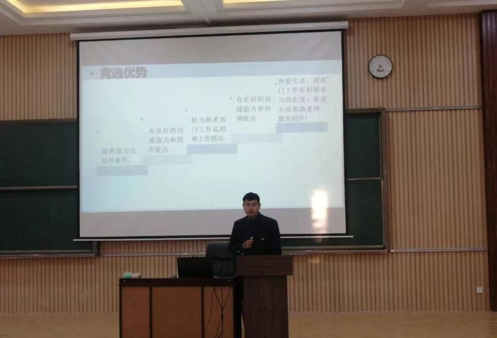 最后,袁庆老师在致辞中表达了对上一届学生会干部工作的肯定与感谢,预祝本届学生会竞选成功,同时提出要求,新一届团委学生会既要认真工作,也不能耽误学习,并对新一届学生会集体寄予了厚望。