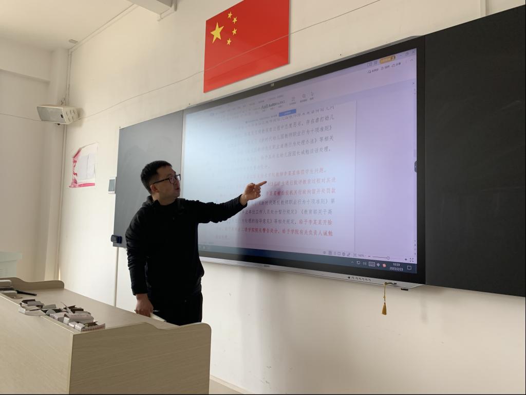 袁老师首先带领全体教师学习《教育部公开曝光第十批7起违反教师职业行为十项准则典型案例》,告诫全体教师要深刻汲取学术造假、体罚学生、师德败坏等案例教训,学习并遵守相关法律法规,依法履行教师职责,以案为戒,严于律己。自觉遵守《中华人民共和国教师法》、《教育部关于高校教师师德失范行为处理的指导意见》等相关规定。