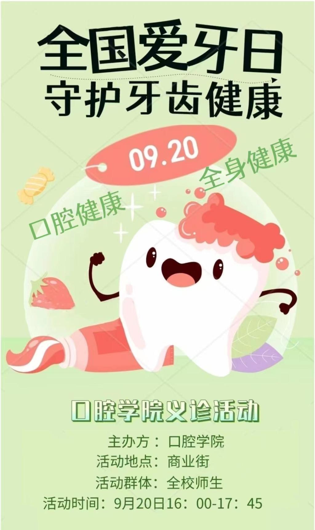 维护口腔健康,增进全身健康;爱牙护齿保健康,生命质量有保障;拥有健康口腔,笑容和谐美丽。2023年9月20日为第35个“全国爱牙日”。为了提高全校师生的口腔健康水平,通过爱牙日活动,在师生间进行口腔保健知识的普及教育,增强口腔健康观念和自我口腔保健的意识,口腔学院于2023年9月20日16:00~17:45在商业街对全校师生进行口腔义诊。