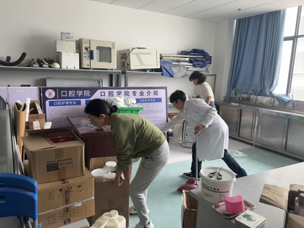 根据十月中旬的自查及实训中心通报的实验室安全检查情况,教研室全体教师逐一对照,进行整改。首先,大家配合仓库管理员刘苛锐老师,按《高等学校实验室安全检查项目表(2024)》要求、遵循化学品分类管理标准,对口腔医学实训耗材进行物品分类、标识及整理;随后,全体教师还对各实训室进行了彻底的卫生清洁。特别值得一提的是,针对实训室407的石膏模型灌注区域,教师们重点清除了残留的石膏,并规范了教师物品摆放区域。