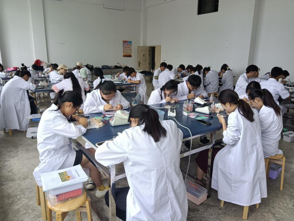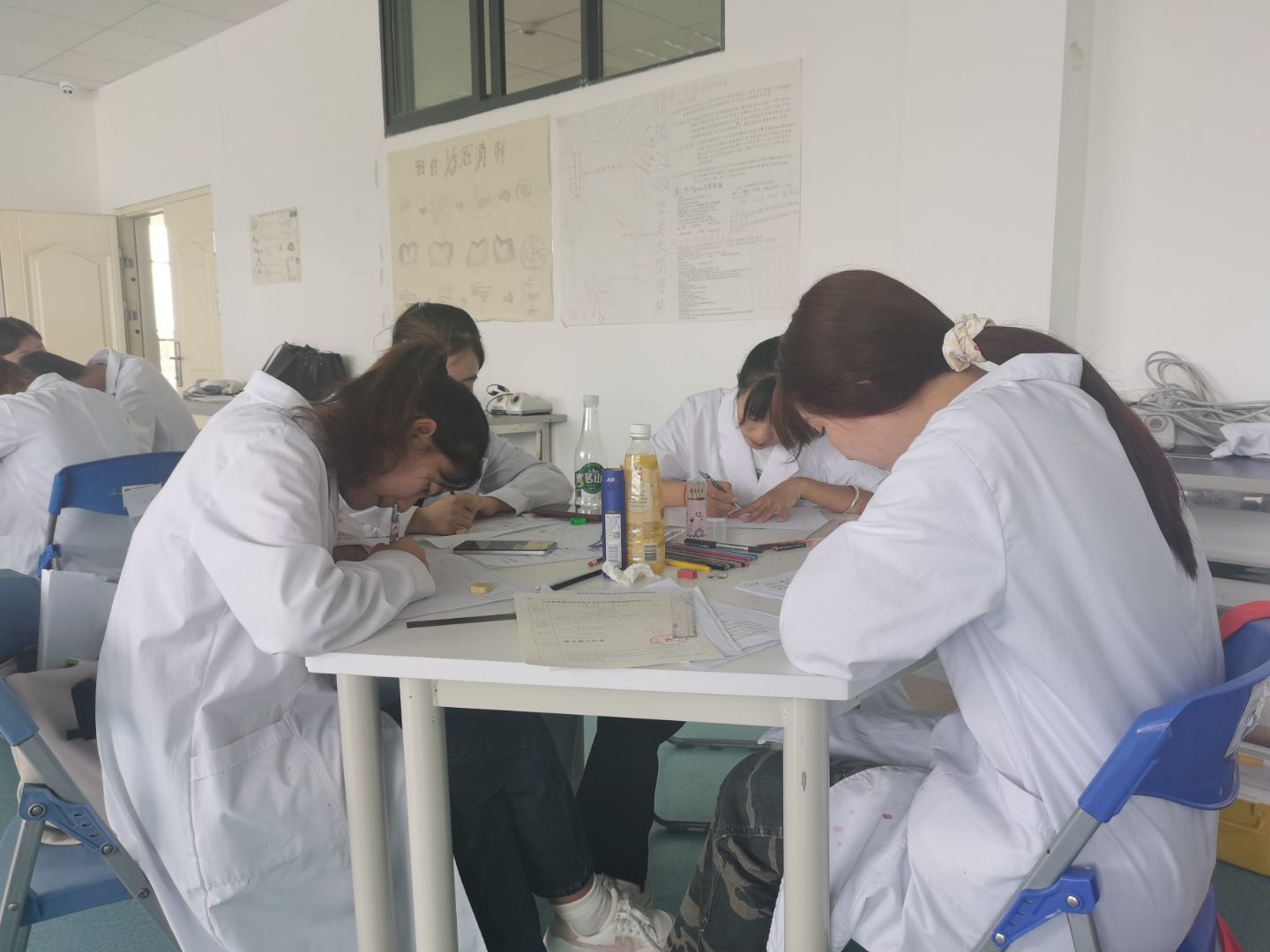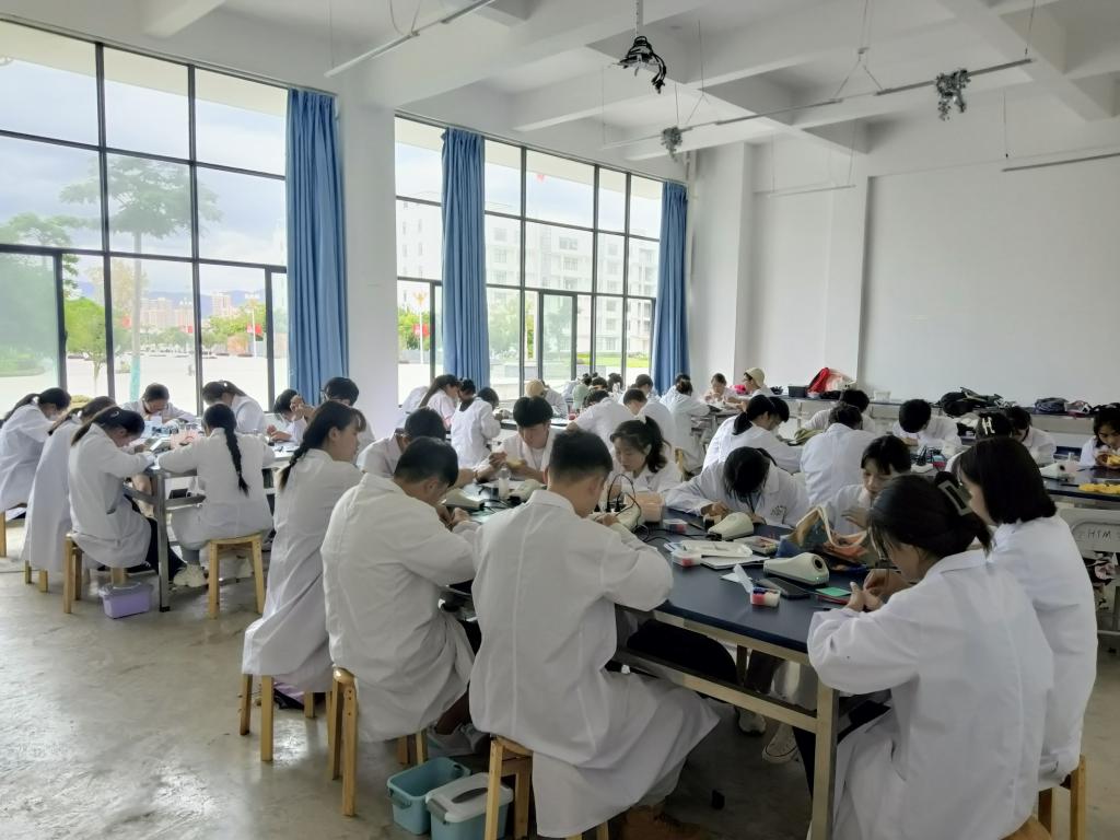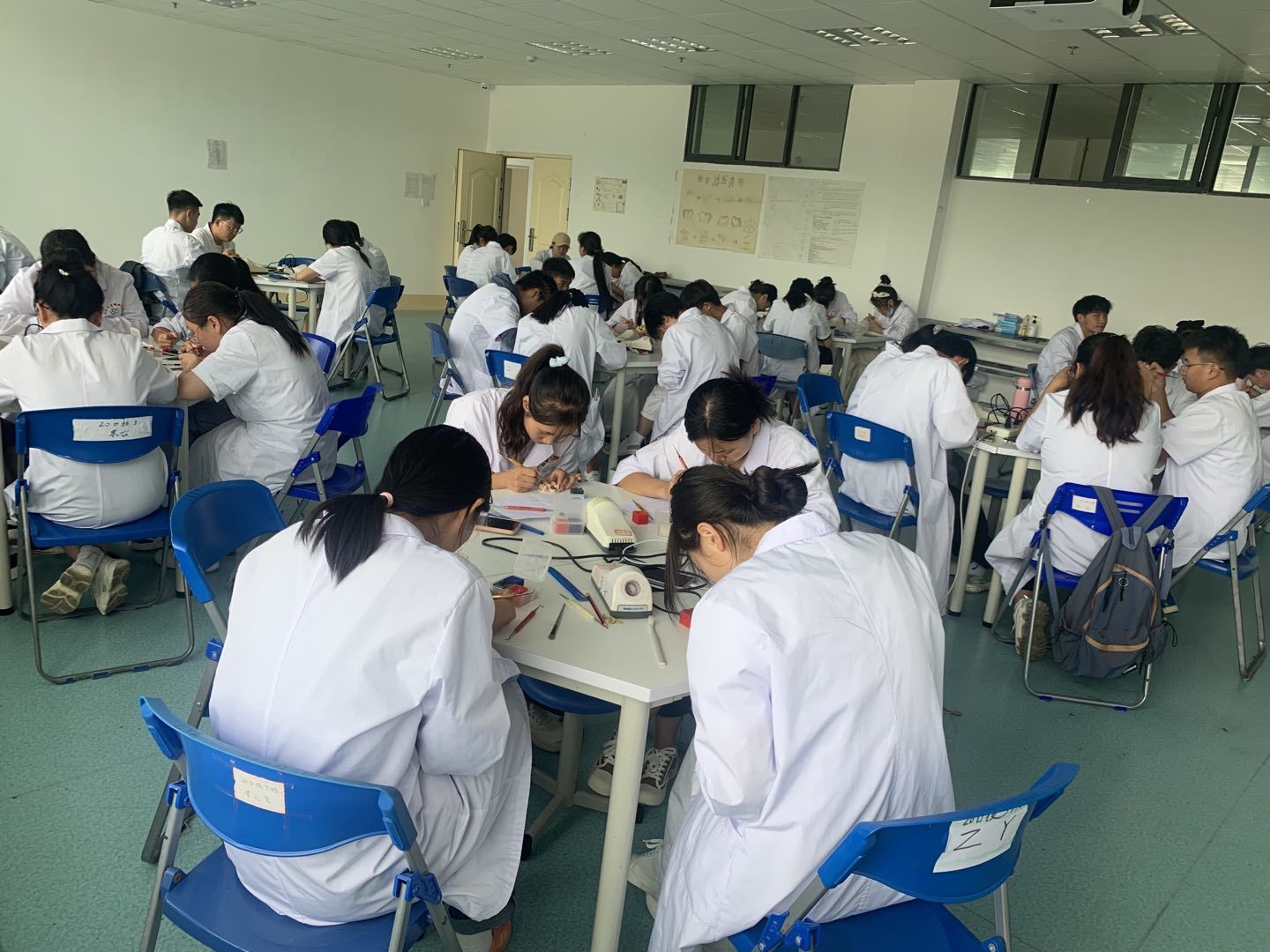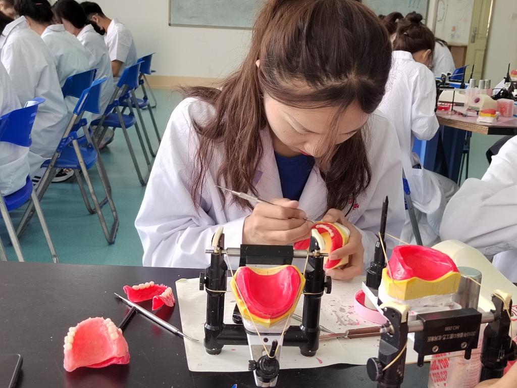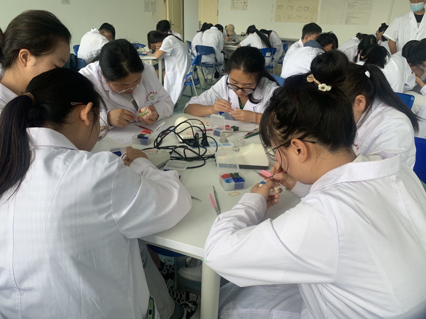 全口义齿排牙的比赛上,同学们把夏天的炎热,身旁酒精灯燃烧带来的高温弃之度外,全身心投入,凭借平时实训课一遍又一遍的练习经验,胸有成竹,一步一步地完成排牙。