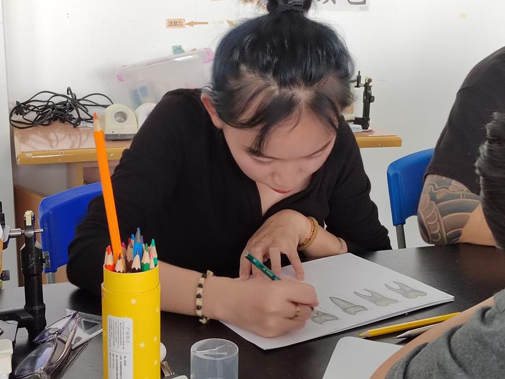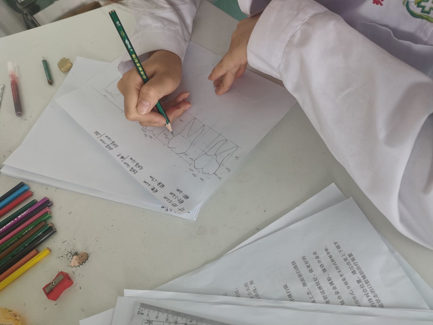 本次赛事为标准3倍大牙体形态绘图。比赛用绘画艺术为载体,加强口腔医学技术专业学生的牙体形的掌握,以作为连接学生未来职业岗位的桥梁,达到以赛促练、以赛促学的目的。赛上,口腔医学技术的同学用绘画技术,显口腔奥义。用手中的画笔描绘出栩栩如生的牙齿形态结构。