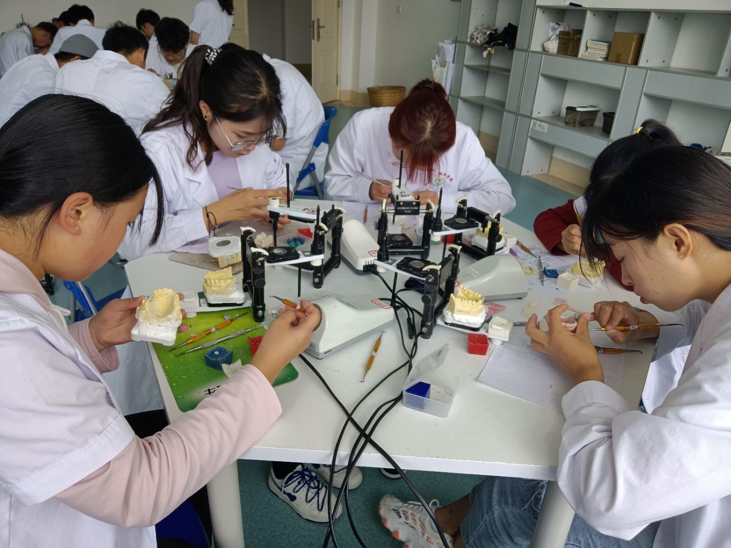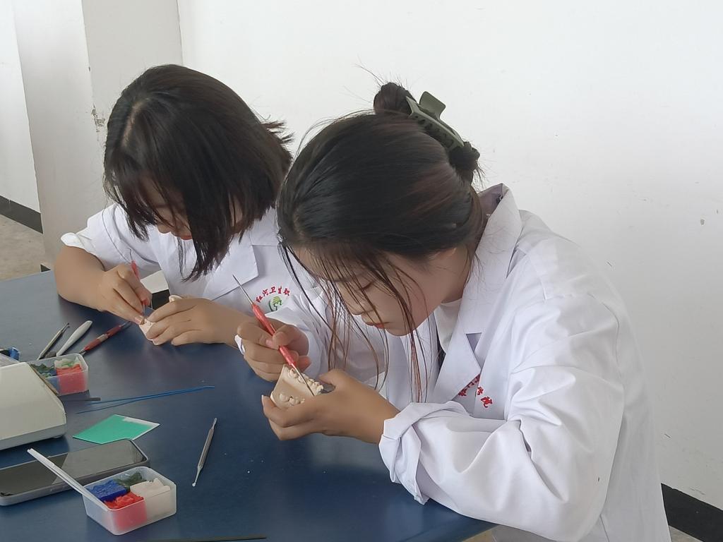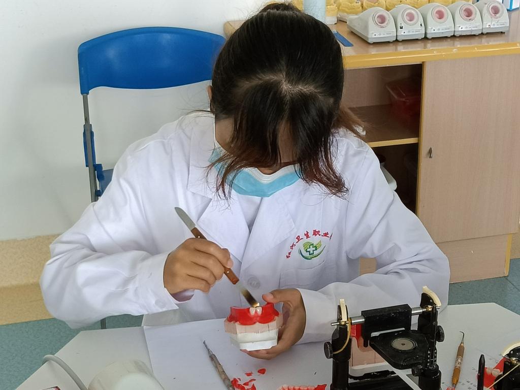 在右上第一磨牙(牙合)1/3的赛场上,同学们左手持圆盘,右手持滴蜡笔,用一滴滴的蜡堆塑出牙的形态。你们眼里的专注,手上的坚定,这是你们在实训课上练习的成果。