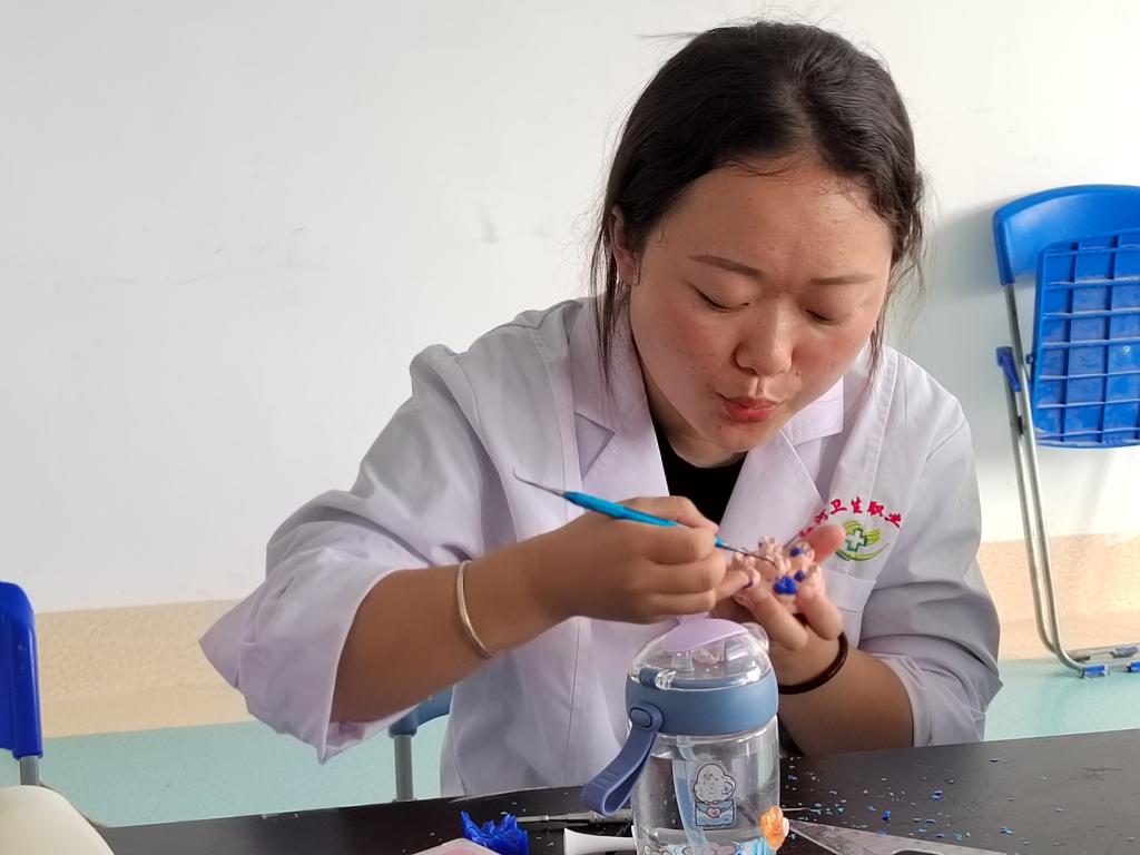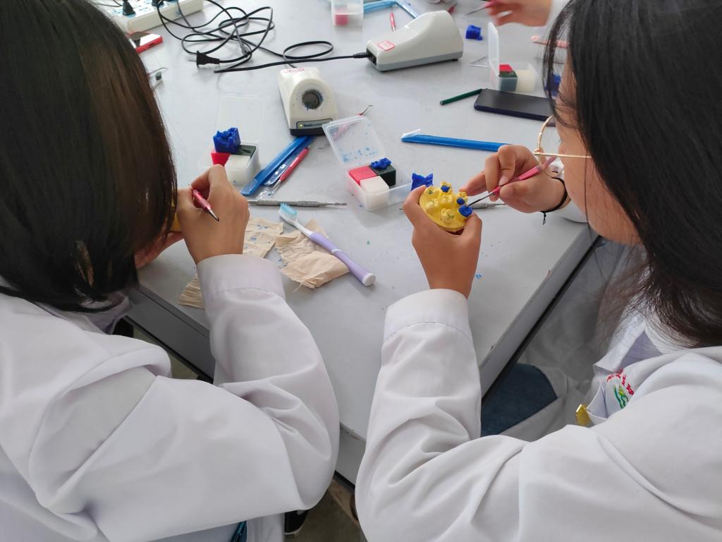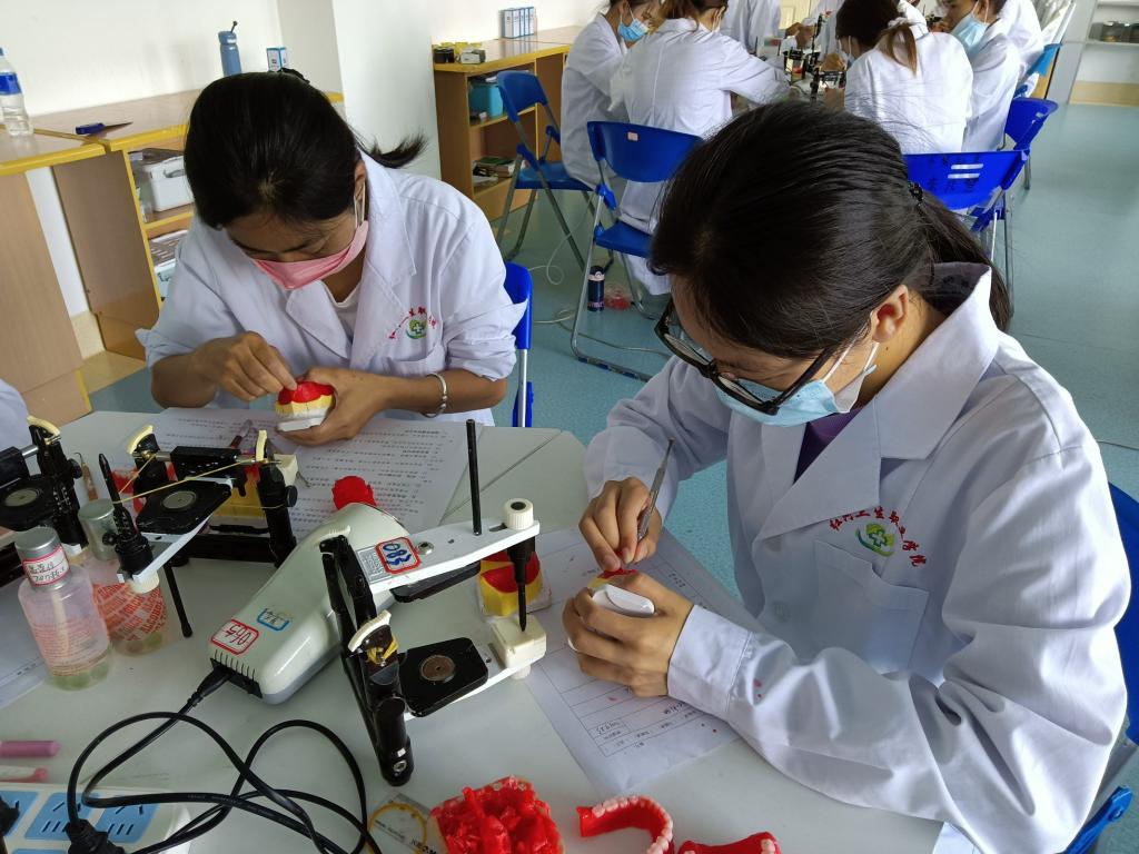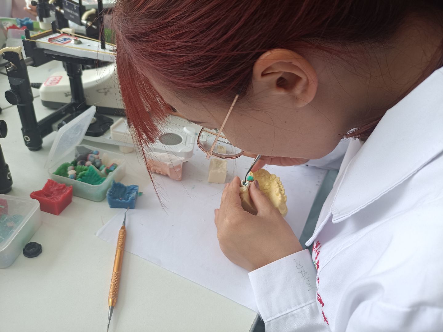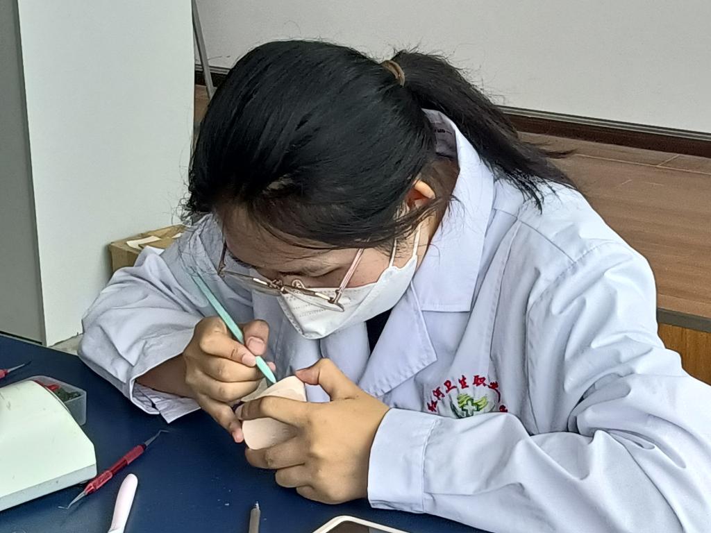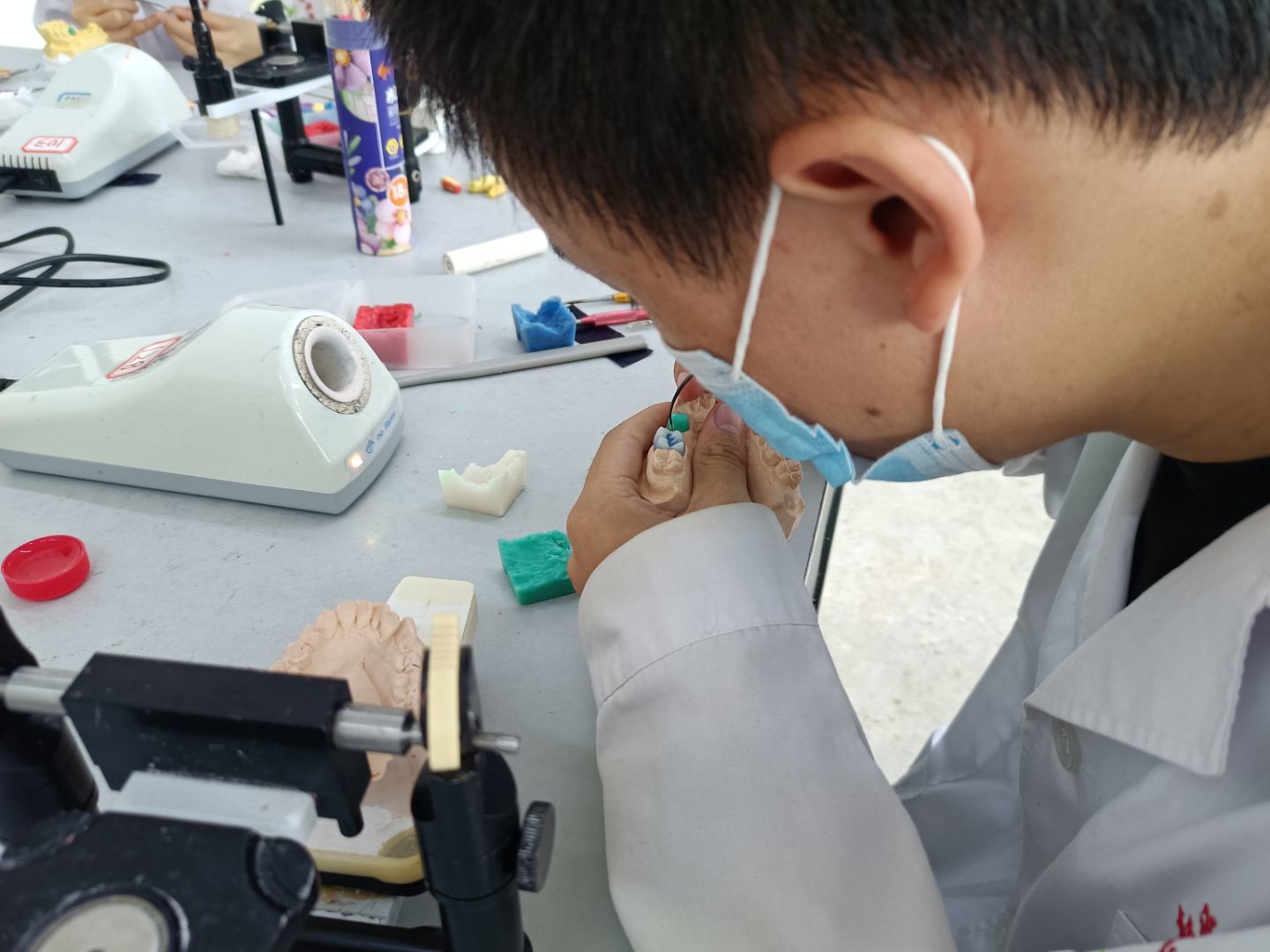 固定义齿桥体(456)蜡型滴塑的比赛上,同学们挥舞着手中的滴腊笔,专注、耐心、细致。只为呈现出一件又一件优美的艺术品,