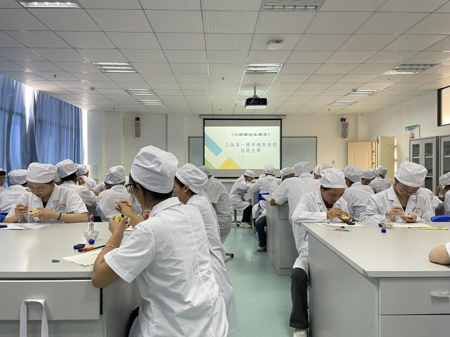 为检验口腔医学专业学生的阶段性教学成果,提升同学们的专业技能,夯实学习基础,以达到以赛促教、以赛促学的学习氛围。口腔学院2022级口腔医学1班和2022级口腔医学2班分别于2023年5月8日、5月11日上午在综合实训楼401举行上颌第一磨牙蜡型堆塑技能大赛。