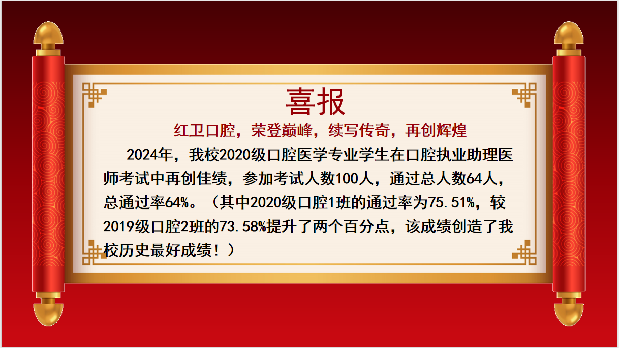 2024年,我校2020级口腔医学专业学生在口腔执业助理医师考试中再创佳绩,参加考试人数100人,通过总人数64人,总通过率64%。(其中2020级口腔1班的通过率为75.51%,较2019级口腔2班的73.58%提升了两个百分点,该成绩创造了我校历史最好成绩!)