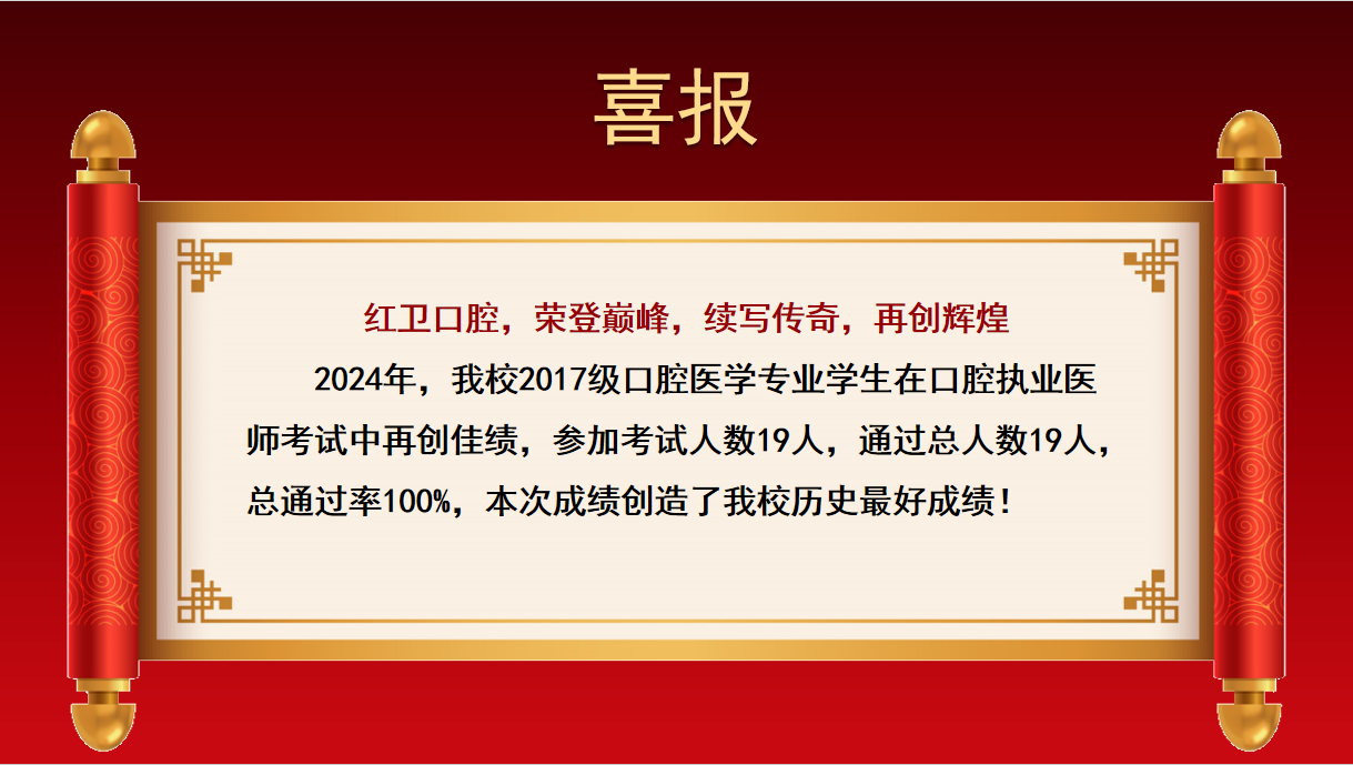 同时2017级口腔医学专业学生在口腔执业医师考试中再创辉煌,参加考试人数19人,通过总人数19人,总通过率100%,该成绩创我校历史新高!