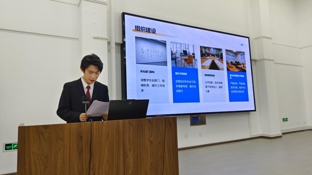 会议在庄严的国歌声中拉开帷幕。第五届口腔学院团委学生会主席团代表马杰婷深情回顾了过去一年在学风建设、活动组织等方面的工作成果,字里行间流露着对学院工作的热忱。随后,第六届口腔学院团委主席团代表吴季原聚焦2025年下半年规划,从创新学生服务模式到深化实践活动等方面勾勒出清晰的工作蓝图,展现出新一届团队的责任担当。