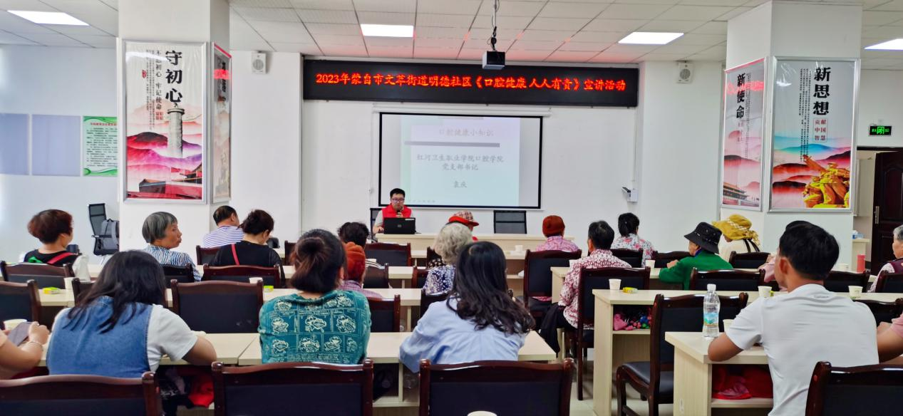 党的十九大对党中央、国务院发布《“健康中国2030”规划纲要》作出重大决策部署,强调坚持预防为主,倡导健康文明生活方式,预防控制重大疾病。口腔是消化道和呼吸道的起始端,具有咀嚼、吞咽、言语、感觉等功能,口腔健康是全身健康的基础。为推进落实预防为主,实施健康中国行动,口腔学院教师党支部于2023年4月14日到明德社区为部分居民开展“口腔健康,人人有责暨爱国卫生我在行动”的主题党日活动。
