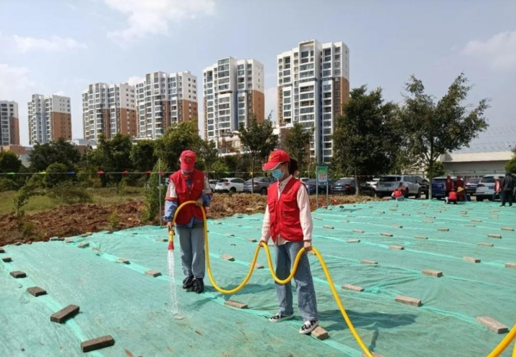 植树现场老师为志愿者分发树苗种子,志愿者们互相配合,分工合作。有的挥锹铲土、有的扶树填土、有的浇水、有的拉盖薄膜。以保证树苗的生长各环节都精心对待,栽得认真,干得卖力,整个植树活动现场呈现一片热火朝天的劳动景象。活动持续开展半天,志愿者们不畏辛苦,以极大的热情投入进来,为绿化校园,打造绿色学习环境贡献了自己的一份力量。