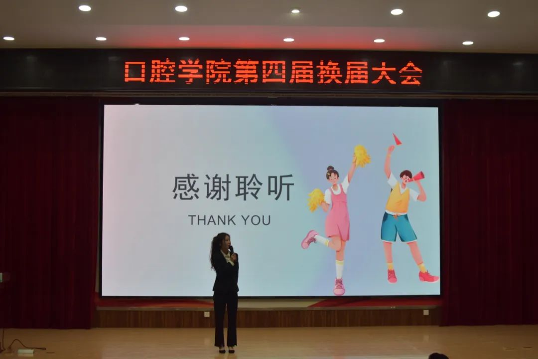 为加强口腔学院团委、学生会的团队建设,促进学生工作顺利进行,2023年5月10日晚上,口腔学院团委、学生会第四届换届大会在图书馆报告厅顺利进行。参与此次活动的有口腔学院党支部书记袁庆、院长陈平、副院长纳锦、总辅导员刘绍康、团委副书记陈诚、口腔学院全体辅导员、任课教师们以及第三届口腔学院学生会主席团成员、学生代表和参与竞选的同学们。