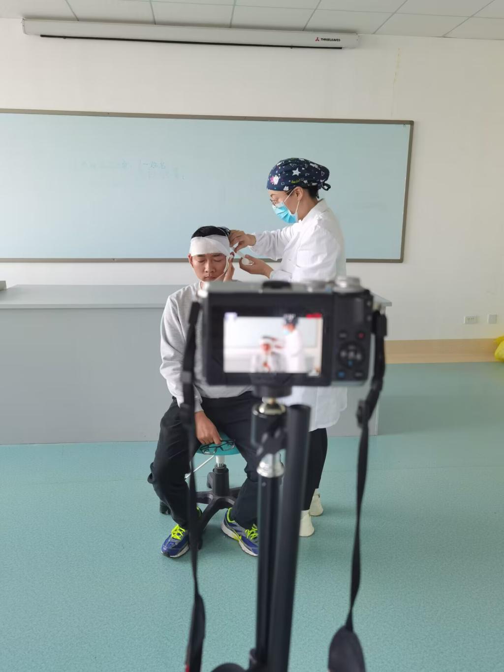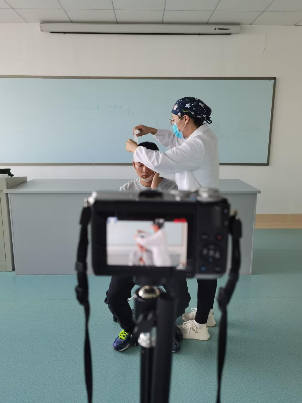 随后,由武婕老师进行常用绷带包扎技术视频录制。绷带包扎是外伤现场应急处理的重要措施之一,及时正确的包扎,可以达到压迫止血、减少感染、保护伤口、减少疼痛及固定敷料和夹板等目的。视频录制过程中,大家从中学习到不同部位适用的包扎方法及注意事项,同时掌握了基本的急救措施,在遇到意外发生时,能够冷静应对,做到互救自救。