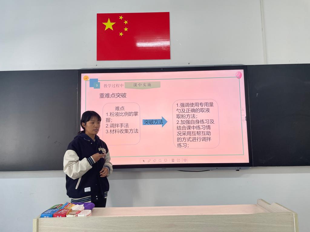 其次由罗梦娜老师就《儿童口腔护理学》中“玻璃离子水门汀调拌”进行课时说课;罗老师首先对课程、学情、教材进行了教学分析;其次在玻璃离子水门汀调拌中她详细阐述了从课前准备到课中实施,再到课后总结的完整教学流程,内容条理清晰,层层递进。