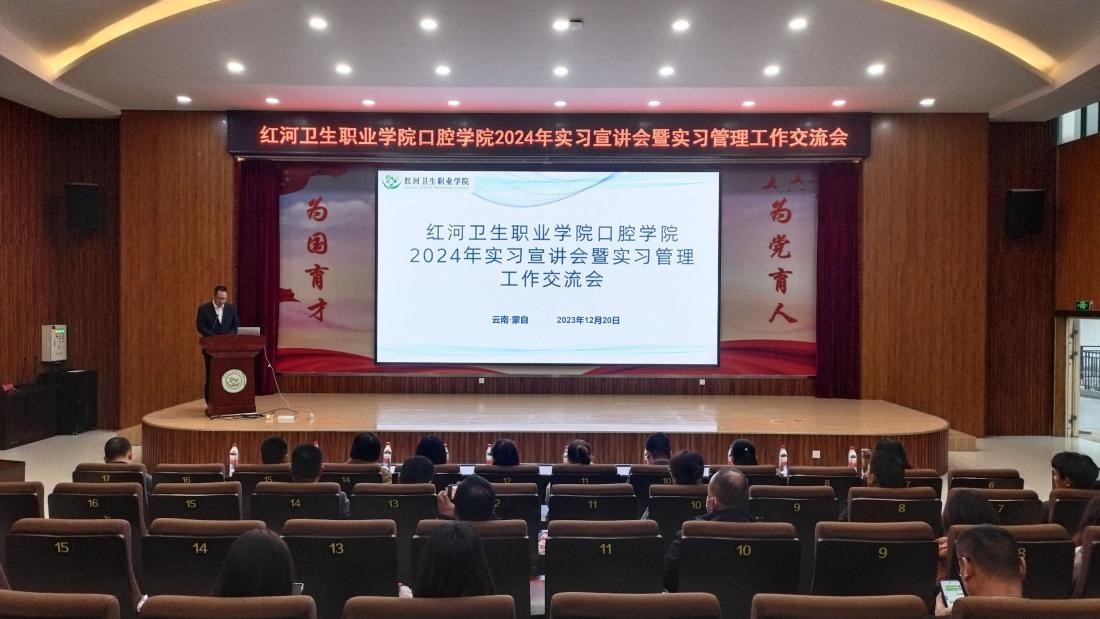 为持续加强校企合作,进一步深化产教融合,促进我校口腔相关专业开拓就业岗位,促进就业工作高质量发展,口腔学院于2023年12月20日在图书馆报告厅举行了“红河卫生职业学院口腔学院2024年实习宣讲暨实习管理工作交流会”。本次活动邀请省内外30家企业代表,主要面向2022级口腔医学专业、口腔医学技术专业和2020级口腔护理专业做实习宣讲;出席本次活动有红河卫生职业学院党委委员、副院长李锋、口腔学院领导以及全体专业教师和辅导员。