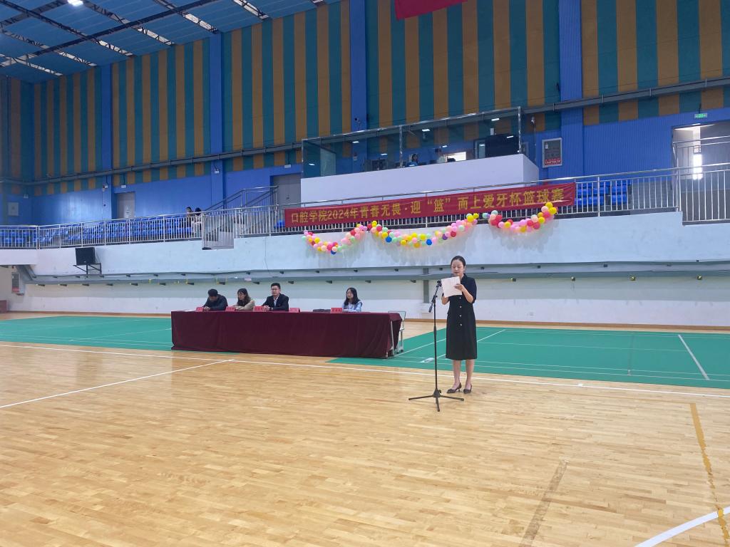 随后,口腔学院团委书记陈诚老师致辞,她的话语如同温暖的阳光,不仅向参赛的篮球健儿们致以最热烈的欢迎与最诚挚的祝福,更激励着每一位在场的学生成为新时代的健康青年,积极投身于体育运动的浪潮中。陈老师的致辞,不仅是对球员们的鼓舞,更是对全校师生的一次心灵触动,唤醒了大家对体育运动的热爱与向往。