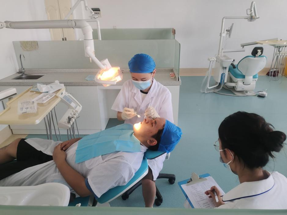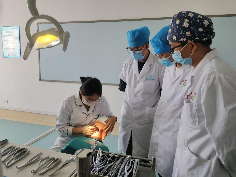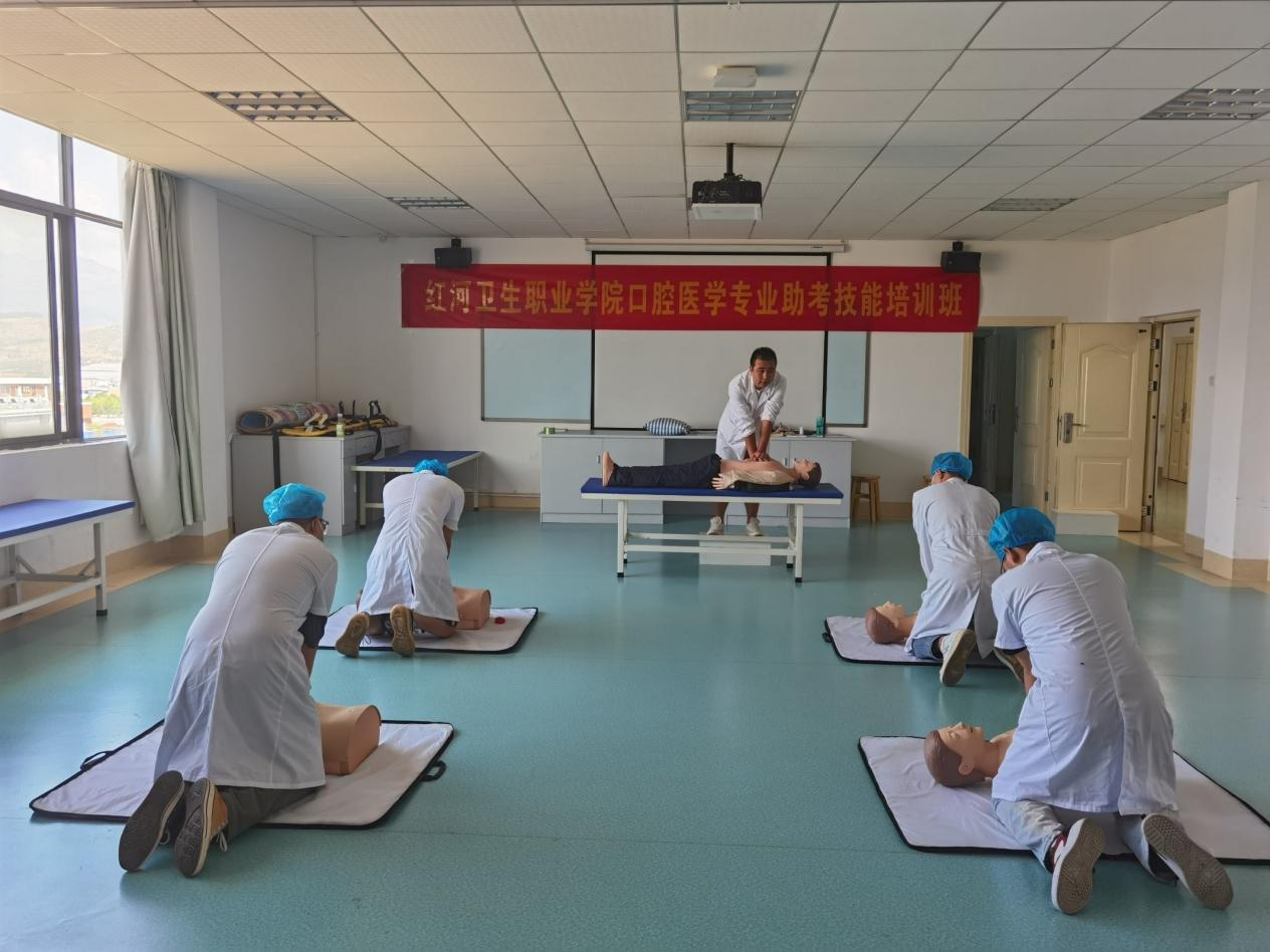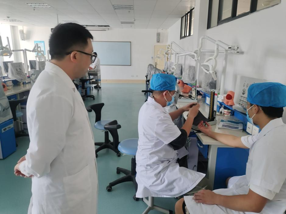 本次培训主要以实践操作培训为主,分为三个项目;第一项目是急救技能培训,在实验实训楼进行,主要包括:吸氧术、人工呼吸术、胸外按压术。第二项目是口腔技能操作培训,在综合实训中心进行,学员们根据自身薄弱环节在培训教师指导下强化练习,主要包括无菌操作、口腔一般检查和特殊检查、开髓术、牙体预备、局麻术、窝沟封闭、包扎术、橡皮障等;过程中培训教师主要针对学员在操作步骤中容易出现问题的地方。第三项目所有学员进行模拟考试,整个流程按照标准技能操作考试要求来进行,旨在真实模拟情境,锻炼学员的职业素养,强化技能操作的熟练程度。