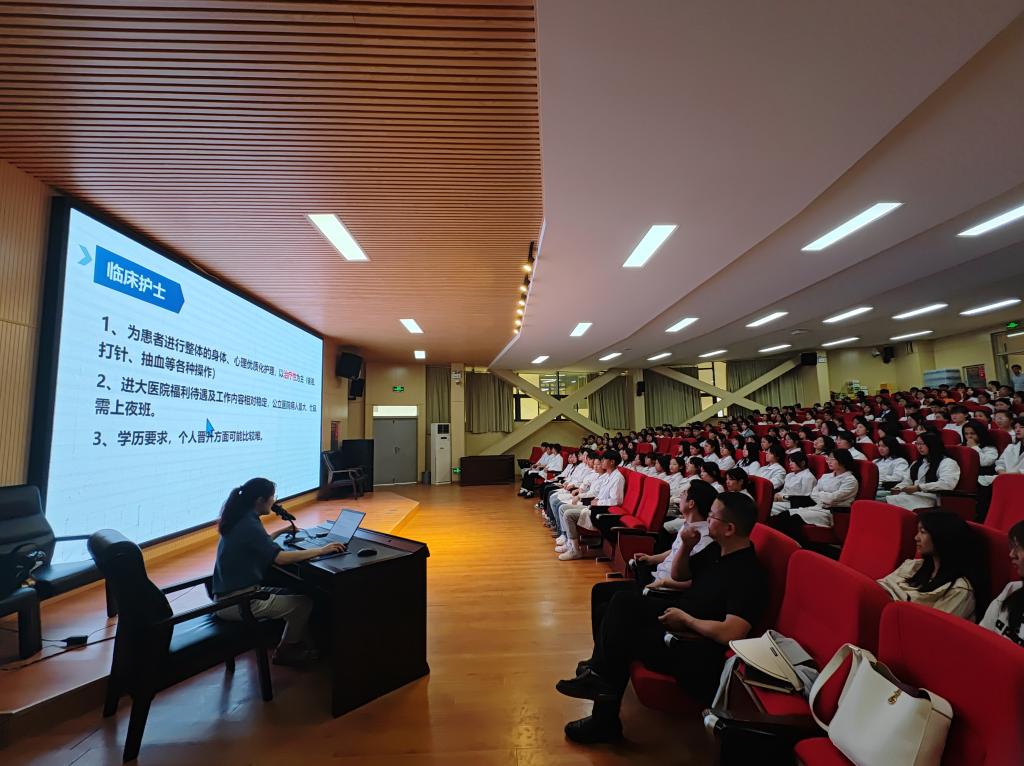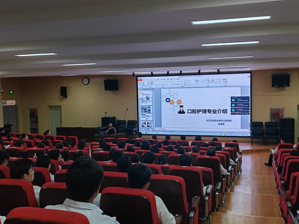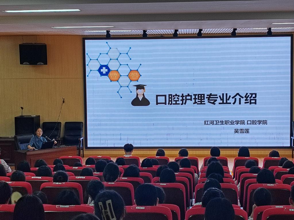为贯彻党的二十大精神,落实国家关于职业教育高质量发展政策,促进现代职业教育高质量发展,推动我校口腔护理专业招生接口的衔接与贯通,2023年4月24日下午14点:30,红河卫生职业学院口腔学院院长陈平老师,口腔护理专业负责人吴雪莲、口腔护理教研室主任李莎一行到红河卫生护理学校针对护理专业五年制转段学生开展2023级口腔护理专业招生宣讲会。