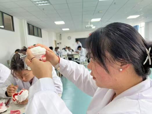 考核过程中,教师团队严格遵循行业规范,对学生的操作细节进行实时指导与纠错。口腔学院一直致力于推行现代学徒制教学模式,通过与企业深度合作,引入资深企业师傅施进钻等专家进行实训指导,实现了理论与实践的深度融合。此次技能考核,正是该教学模式下的一次重要实践,既是对学生们阶段性学习成果的全面审视,也为他们未来的实习与就业提供了有力的能力证明。