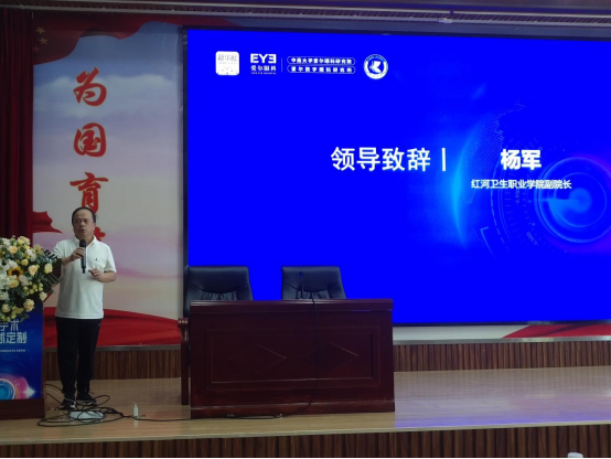 红河卫生职业学院副院长杨军致开场词,对到场参加活动的专家、教师与学生们表示热烈欢迎,阐述“屈光手术技术新进展”专家研讨会与发布《中欧国际近视白皮书2.0》在职业教育中启迪专业智慧、引领人才进步、开拓学术视野、促进国际交流的重要意义,殷切希冀同学们以学习国内外屈光手术技术和解读《中欧国际近视白皮书2.0》内容作为深入学习国际屈光手术先进技术、拓展知识储备、引领学业进步、开拓国际视野的契机。