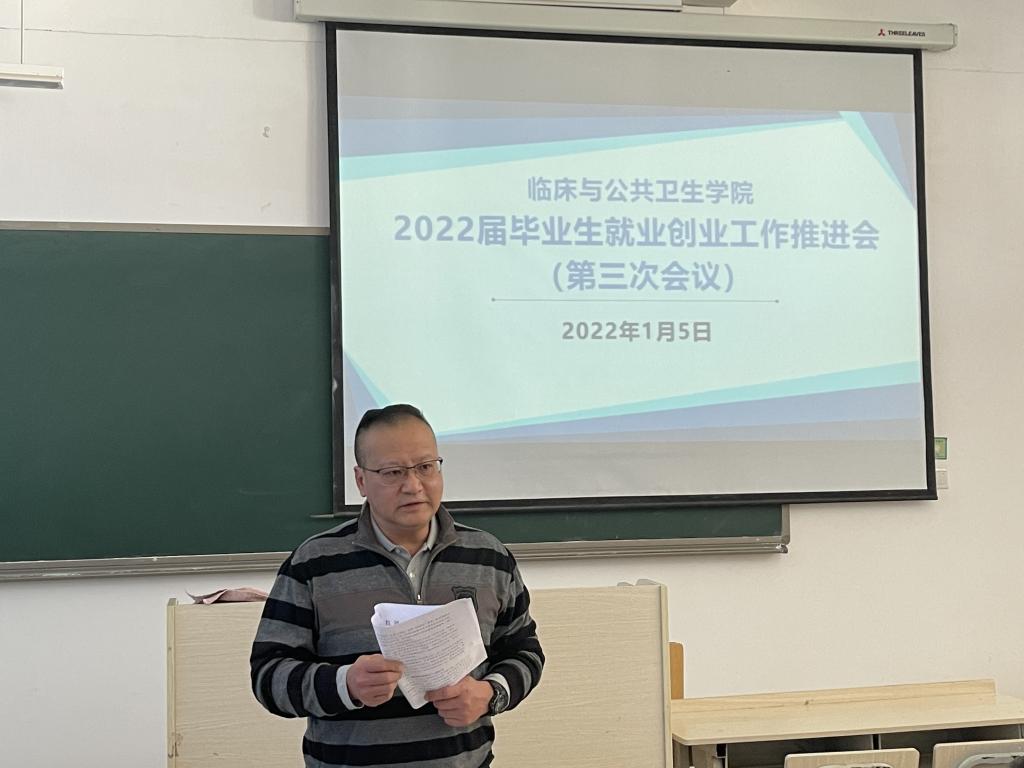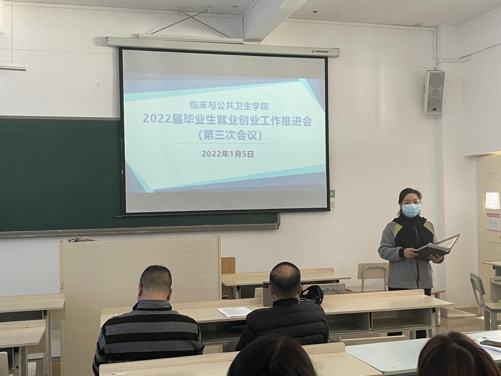 2022年1月5日下午15:00,临床公卫学院就业创业工作推进会议在南503举行。杨军副院长、杨雅麟书记、林坚院长、临床公卫学院各党支部书记、专业负责人、2022届毕业班班主任和全体辅导员参加会议。