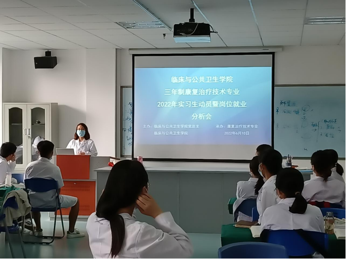 2022年6月10日上午,临床与公共卫生学院康复治疗技术专业在综合实训室304开展实习动员大会暨岗位就业分析及职业暴露宣讲会,由康复治疗技术专业丁艳丽老师进行宣讲,全体20级康复治疗技术专业学生参会。