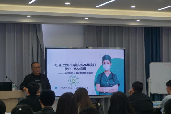 为更好拓宽2026届毕业生就业渠道,助力毕业生高质量就业,持续推进学校与用人单位的合作,促进学生与用人单位的双向选择,2024年11月5日至11月7日,临床与公共卫生学院院长林坚、党总支副书廖洪阳、分管班级辅导员及班主任到我校医教协同点(红河州第二人民医院、建水县人民医院、蒙自市人民医院)开展福建省部分事业单位招聘红河卫生职业学院2026届实习就业一体化毕业生宣讲。