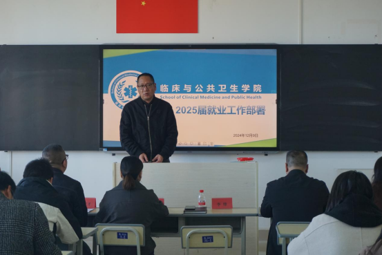 临床与公共卫生学院院长林坚对学院2024届就业工作取得的成效肯定,并对做好2025届毕业生实习就业期间阶段任务进行了部署。指出医疗卫生类专业就业竞争压力大,班主任辅导员一定要提前部署工作,做好学生思想工作,不浪费岗位,精准推送。他强调,一是要积极动员学生参加专升本考试,同时积极投简历求职。二要鼓励学生积极就业,寻找对口行业就业,严格办理转实习手续。