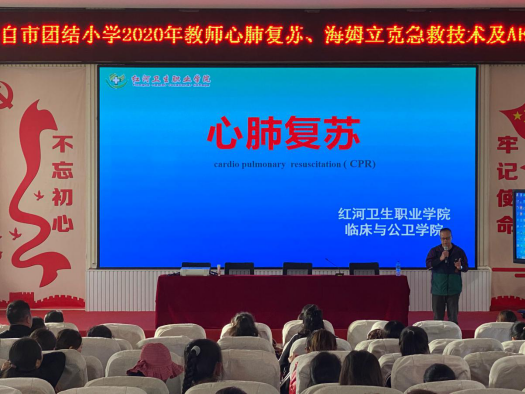 为有效提高中小学教师面对突发危及学生生命的应急反应及具备相关急救知识技能,2020年12月11日下午,红河卫生职业学院临床与公卫学院院长林坚带领杨丰毓、徐维松、朱纹懿、钱俊成一行五名专业教师,到蒙自市团结小学进行“院外心肺复苏、海姆立克急救及AED培训”专题讲座,全校100余名教职工参加了此次讲座。