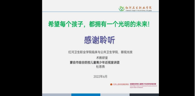 2022年6月28日,红河卫生职业学院临床与公共卫生学院眼视光技术专业老师杜思燕,受邀参加快乐六一幼儿园、金禾苗幼儿园近视防控宣讲,宣讲于当天傍晚18:00准时在腾讯会议举行。