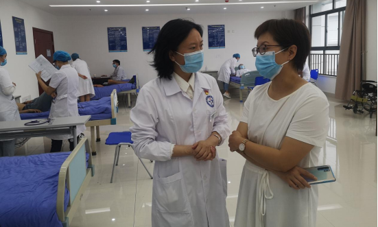 3. 临床与公卫学院副院长王方通过观察正在进行技能考核的同学,与科教部副主任陈燕及考官交流,希望在今后的工作中多交流,互相学习,帮助同学们提高实践技能。