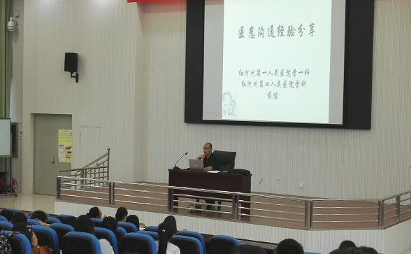 2017年5月22日晚自习,临床医学系聘请红河州第四人民医院骨外科主任蒋俊给临床专业学生做《医患沟通》系列讲座二——《医患沟通经验分享》。讲座主要围绕外科手术病人救治过程中询问病史、术前谈话、术后病情告知等方面进行,最后蒋主任模拟标准化病人,用临床典型案例和学生现场进行医患沟通情景模拟,真实再现临床医患沟通,具有趣味性,激发学生思考,并进行点评和总结,让学生真正体验医患沟通的技巧和方法。