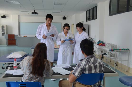 本次大赛参赛者为15级同学,3人一组,分18组,5组进入决赛。16级同学有12人扮演标准化病人,其他同学观摩比赛。每组抽签选定病人,比赛内容依次分为四块:患者面谈、康复评估、治疗和临床思维,最后由评委进行指导点评。