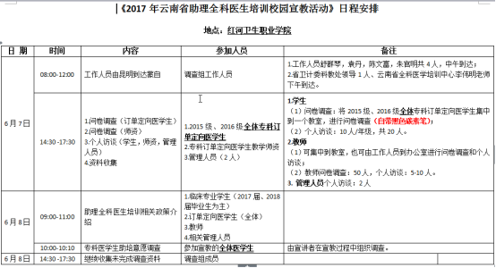 活动时间为2017年6月8~9日,由临床系2015~2016级临床医学专业订单定向学生及所有专业课任课教师、班主任参加。临床系共参与访谈的教师10人,招生就业处的李锋老师也作为管理人员访谈。参与访谈的学生共26人,均为订单定向的学生;问卷调查针对订单定向的96名同学。云南全科医生培训中心办公室主任李伟明老师还给订单定向的学生做助理全科医生培训相关政策介绍。