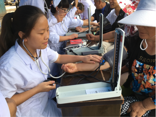 活动现场,临床医学系和护理系的志愿者们为雨过铺镇的群众进行口腔检查、测血压、测血糖等免费检查,并向过往群众发放健康知识宣传单,进行常见疾病预防知识的普及。