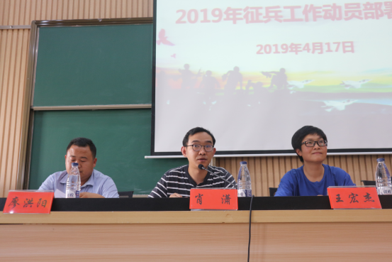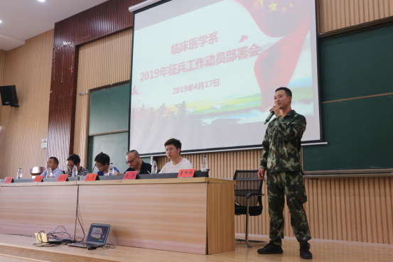 为贯彻落实国家征兵政策,提高兵源质量,进一步鼓励和引导我校大学生应征入伍,2019年4月17日16:30分临床医学系在教学楼阶梯教室隆重召开2019年征兵动员部署会。学生处副处长王宏杰、临床医学系系主任林坚、临床医学系党支部书记肖潇、临床医学系全体党员、班主任、辅导员、全体在校男生及有入伍意向的女生参加了本次会议。临床医学系总辅导员普林老师担任本次会议主持人。