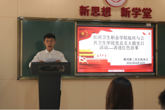 紧接着由教师第二党支部的杨怀毅、段云龙两位同志为大家讲述了“这辈子跟着中国共产党是我最大的光荣——杨家训”、“石屏籍革命烈士——许志”的红色故事,全体党员同志认真聆听,深受感动和鼓舞。