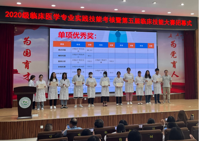 临床医学专业实践技能考核暨第五届临床技能大赛具体获奖情况如下:一等奖胡文博、吴雨娟、孙铁岩、赵国帼;二等奖:朱会琴、徐艳、刘彩琴、王月娇、黄家文、余贵芹;三等奖:合嘉琪、尹国帅、张雅婷、李晓春、尹志敏、罗芳芳、黄圣.、杨尹月、宋富萍、杨淳。单项优秀奖:病史采集优秀奖母昌英,体格检查优秀奖 闻双,无菌技术优秀奖 祁永回,外科基本操作优秀奖王高琪、黄加琼,徒手心肺复苏优秀奖陈艳美、孙铁岩、黄琴、赵建竹,创伤急救优秀奖黄琴,辅助检查优秀奖 陆尚云,案例分析优秀奖 资会玲,胡文博。