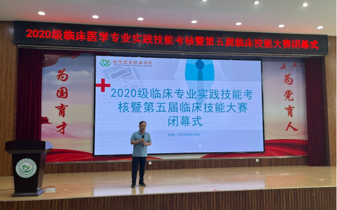 6月18日下午,我院临床医学专业实践技能考核暨第五届临床技能大赛闭幕式在图书馆报告厅隆重举行。红河卫生职业学院副校长杨军、红河卫生职业学院临床与公共卫生学院院长林坚、红河卫生职业学院临床与公共卫生学院副院长王方、红河卫生职业学院临床与公共卫生学院党总支副书记杨丰毓,全体临床医学专业教师及20级临床医学专业学生参加闭幕式。