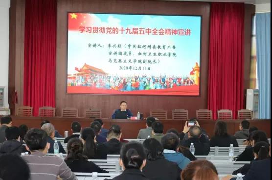 2020年12月11日下午,开远市教育体育局学习宣传贯彻党的十九届五中全会精神宣讲报告会在开远市第一中学第三报告厅举行。州委教育工委宣讲团成员、我校马克思主义学院副院长李兴旺到会作宣讲报告,开远市教育体育局机关干部职工、城区学校领导班子成员、思政课教师代表共102人聆听了报告。