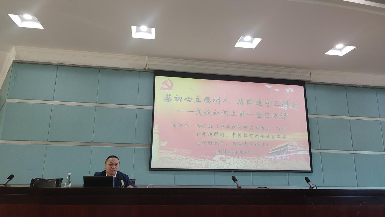 为促进我州大中小学思政课教师的教学能力提升,特举办第一期红河州思政课教师能力提升示范培训班,在州委教育工委的邀请下,2021年11月4日上午,我校马克思主义学院副院长李兴旺老师前往红河学院给来自全州13个县市的思政课教师代表开展专题辅导。