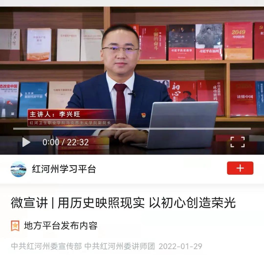 为认真学习宣传贯彻党的十九届六中全会精神,由州委宣传部、州委讲师团邀请省、州共六位社科专家录制党的十九届六中全会精神系列宣讲片,帮助全州各族干部群众全面学习把握党的百年奋斗取得的重大成就和宝贵历史经验,引导广大干部群众以史为鉴、开创未来,更加坚定、更加自觉地践行初心和使命,推动红河高质量跨越发展,以优异成绩迎接党的二十大胜利召开!其中,马克思主义学院副院长李兴旺所作的《用历史映照现实 以初心创造荣光》宣讲片已上线学习强国,让我们一起来学习。