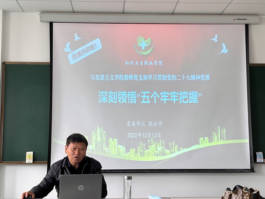 为深入学习贯彻党的二十大精神,切实把思想和行动统一到党的二十大做出的重大决策部署上来,把智慧和力量凝聚到党的二十大确定的目标任务上来。2022年12月13日14:30,马克思主义学院教师党支部在综合实训楼201教室组织开展专题党课活动,马克思主义学院教师党支部全体党员参加学习,红河卫生职业学院党委书记张云学作专题授课。